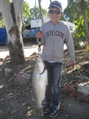 The fishing this year has been a dissappointment after previous year. The bigger grunter never came in the river. The barra were good early but were hard to catch later even for the fishing guide. Some good catches were recorded off shore although. Matty, in the first photo, caught his first barra 79 cm and 5 kg.